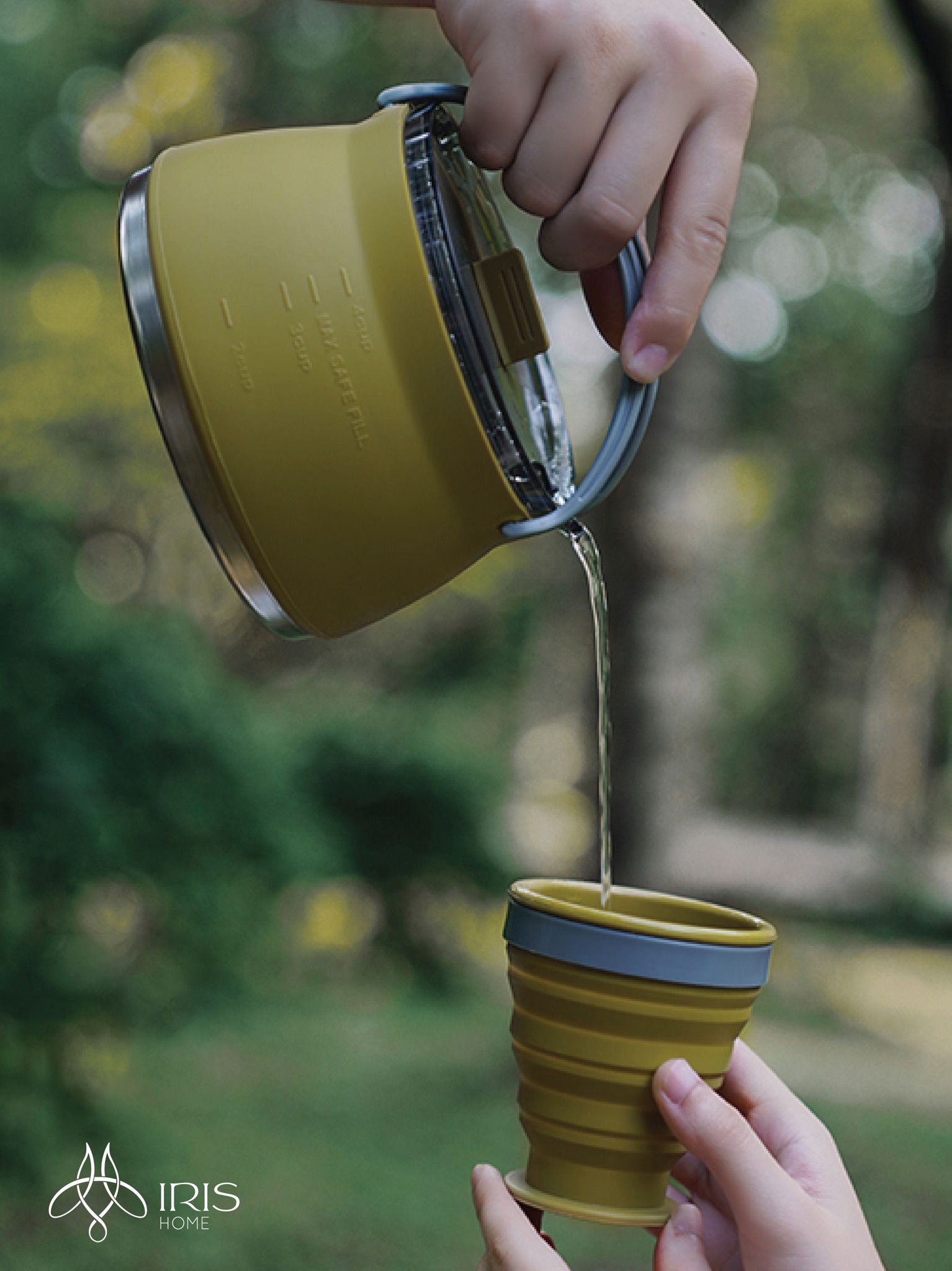 Tên: Ấm du lịch bằng silicon màu xanh vàng, chi tiết thép không gỉ 304, dung tích 1000ml. Có thể gấp gọn sản phẩm