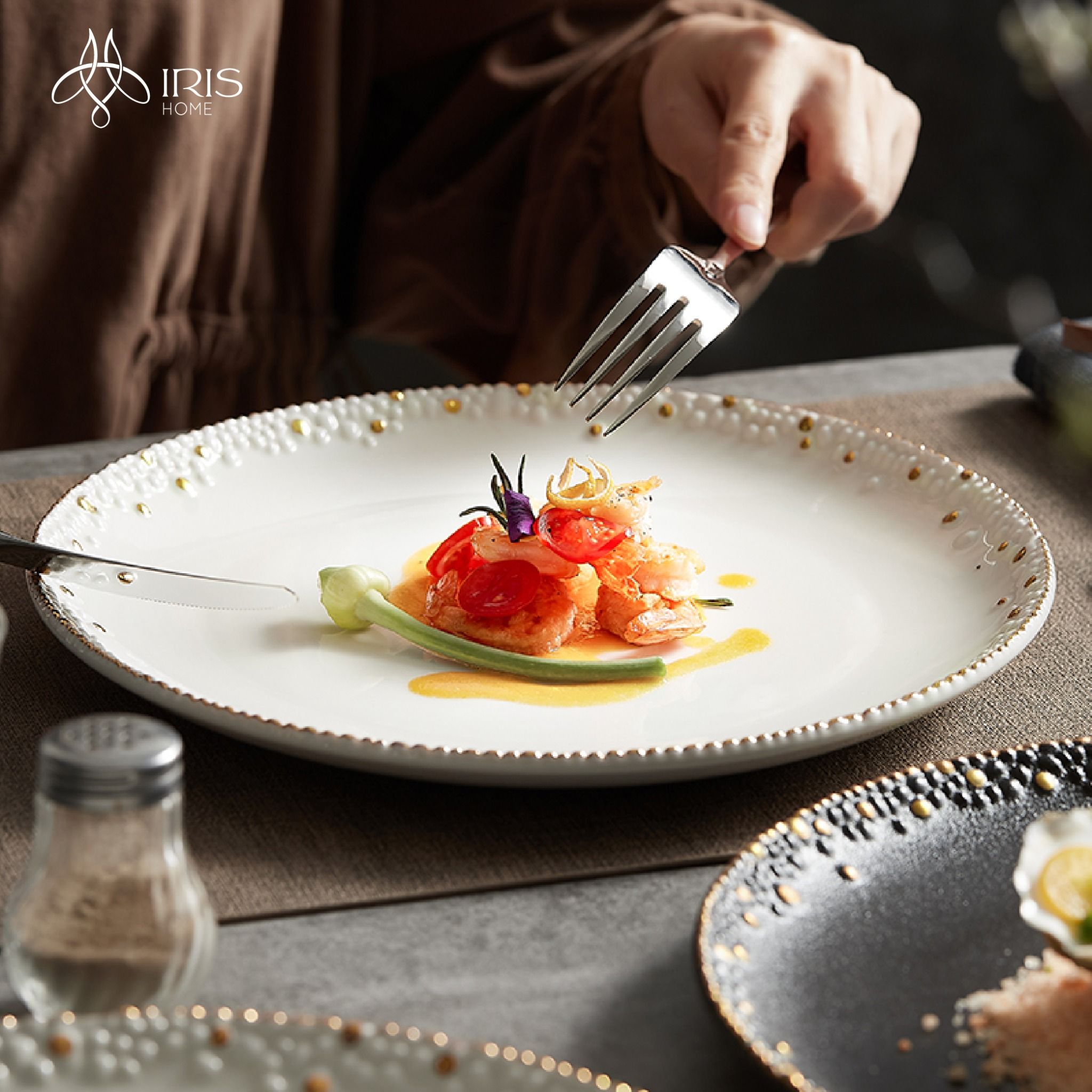 Bát ăn và đĩa tròn viền trang trí hoạ tiết chấm tròn