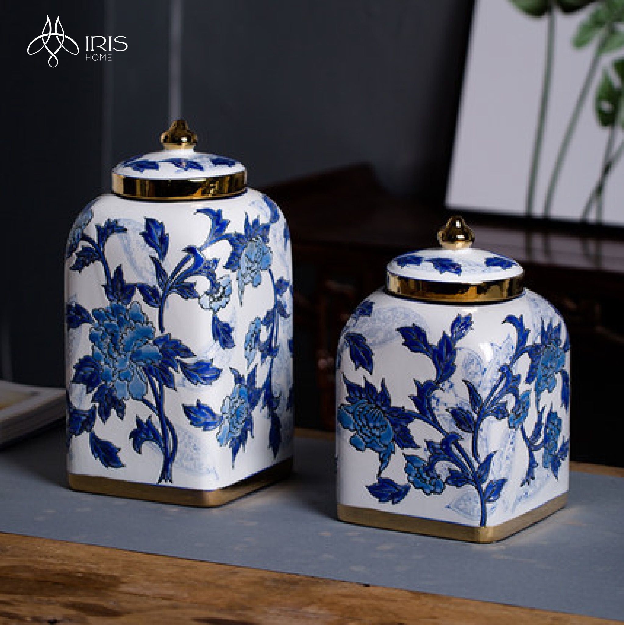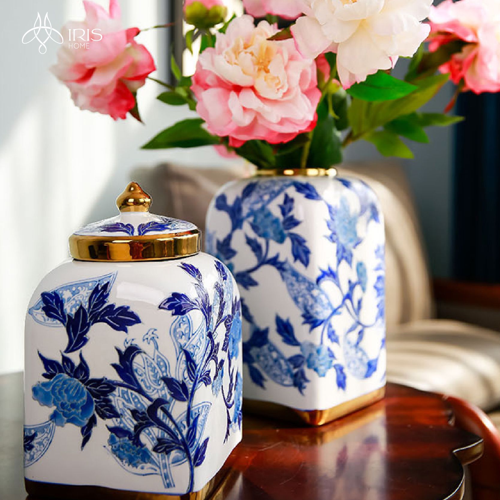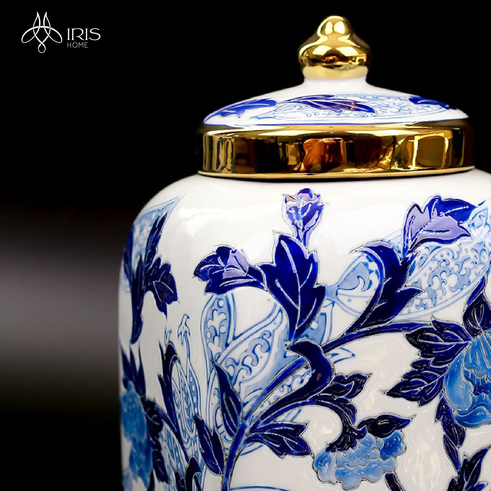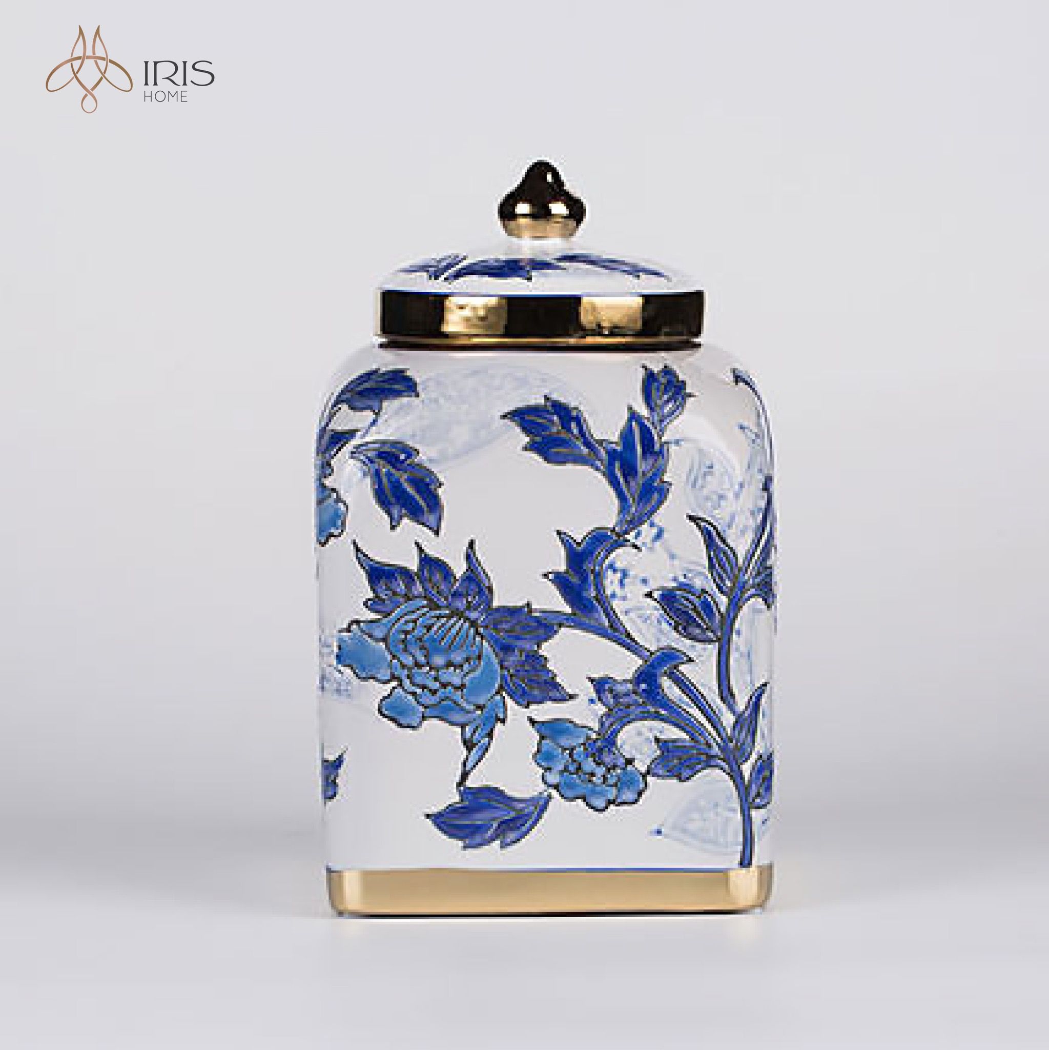 Bình gốm sứ hoạ tiết dây hoa xanh trắng