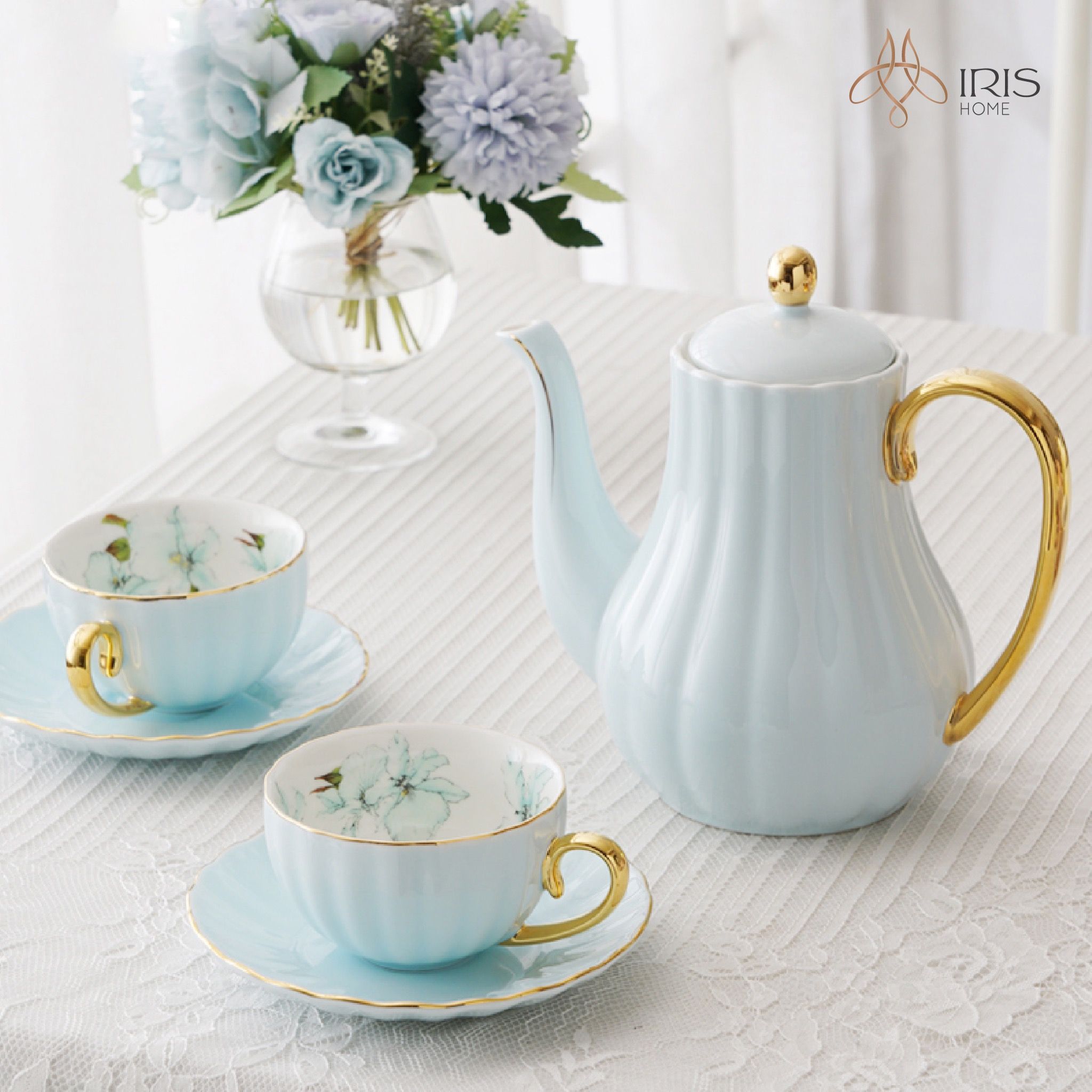 Bộ ấm chén sứ tráng men xanh bóng, chi tiết vàng vẽ tay 1000ml