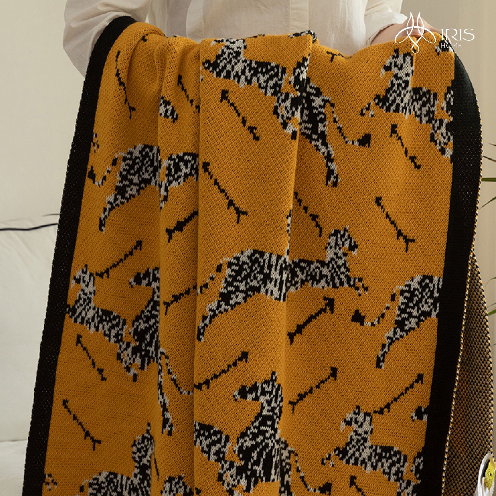 Chăn trải sofa in hoạ tiết đen trắng trên nền vàng viền đen