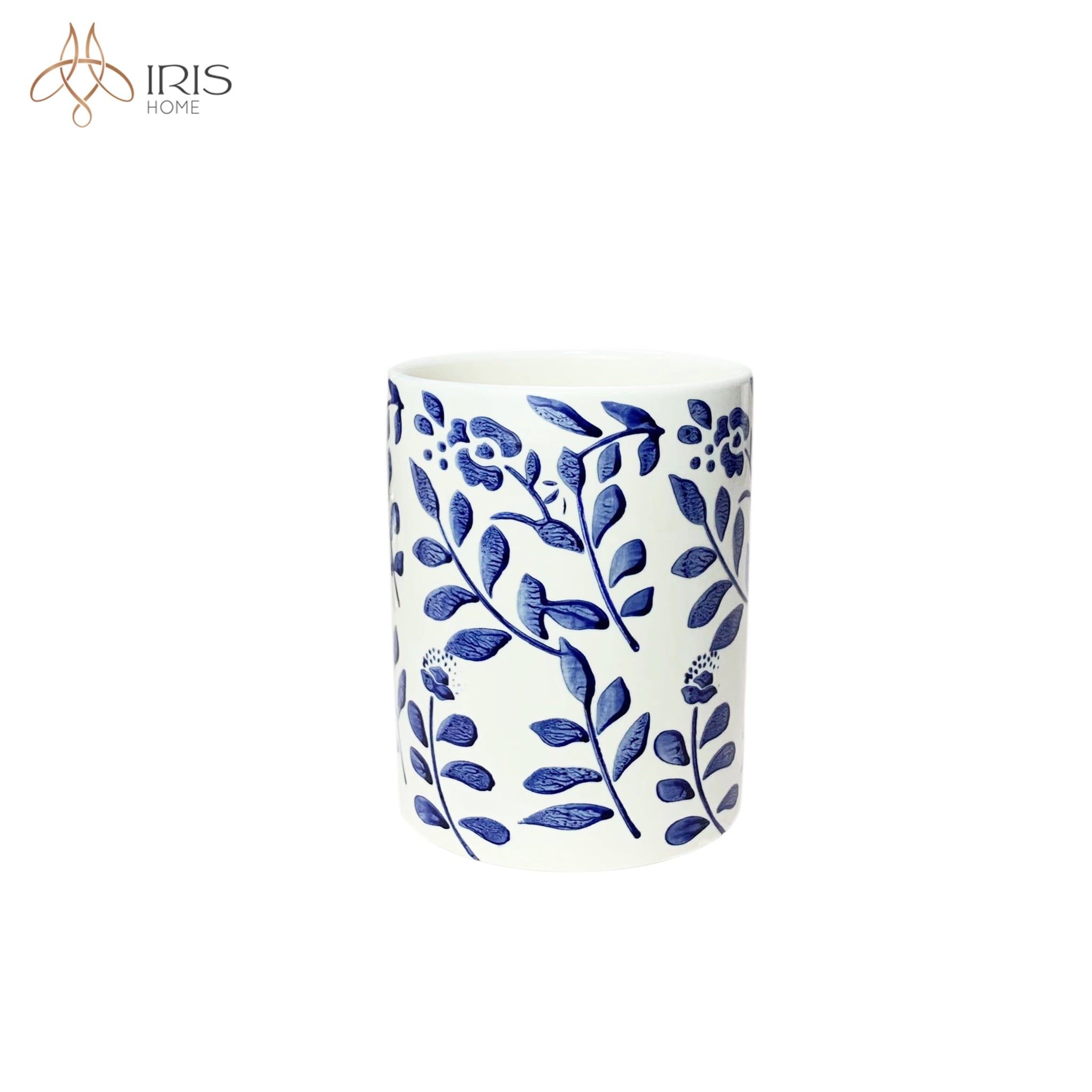 Chậu cây hình trụ hoạ tiết hoa trắng xanh