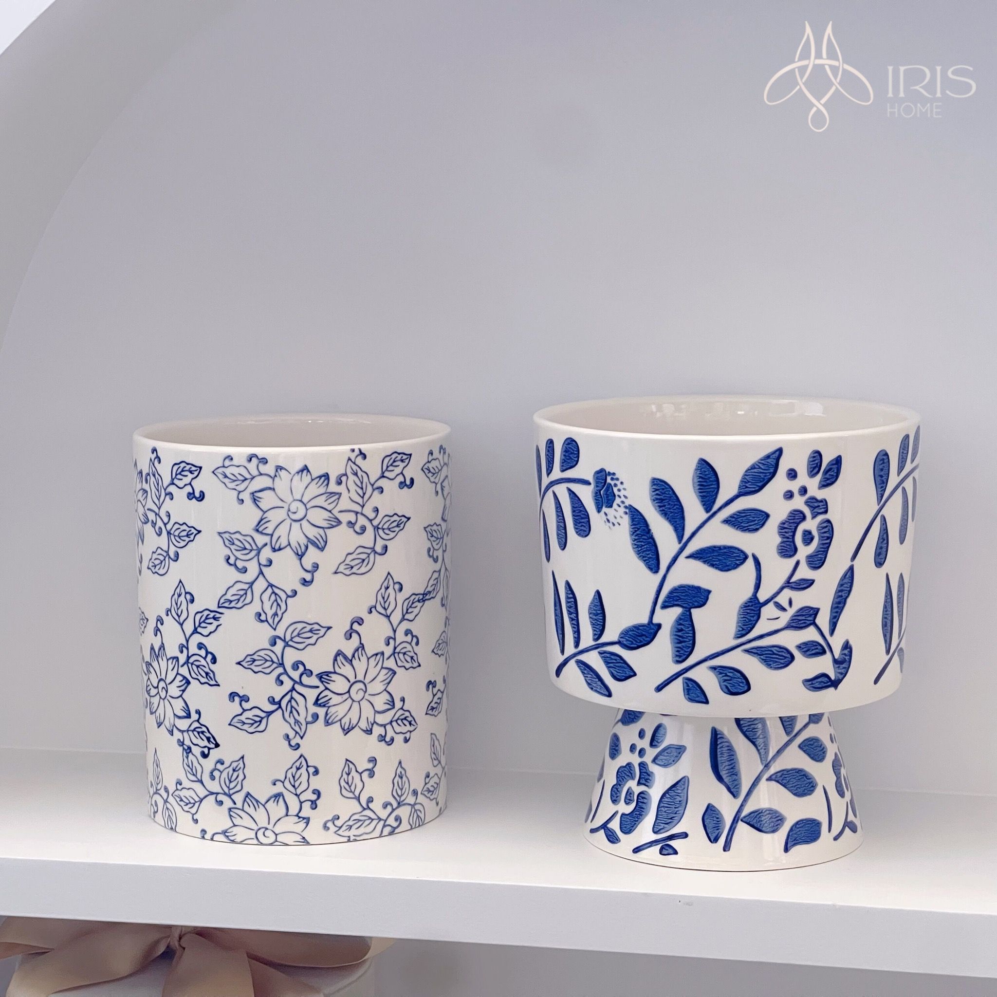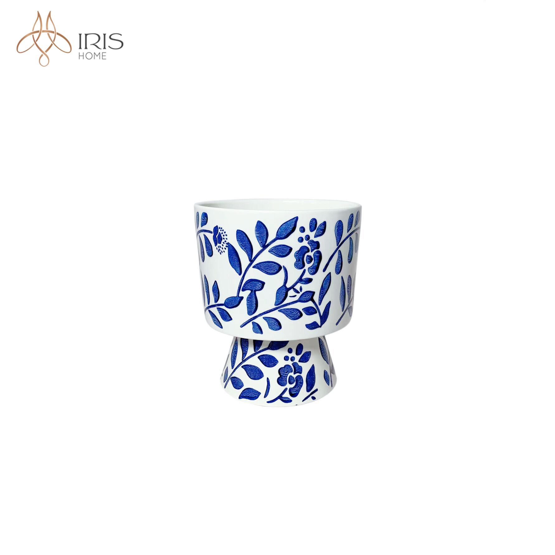Chậu cây tròn đế chóp hoạ tiết hoa trắng xanh