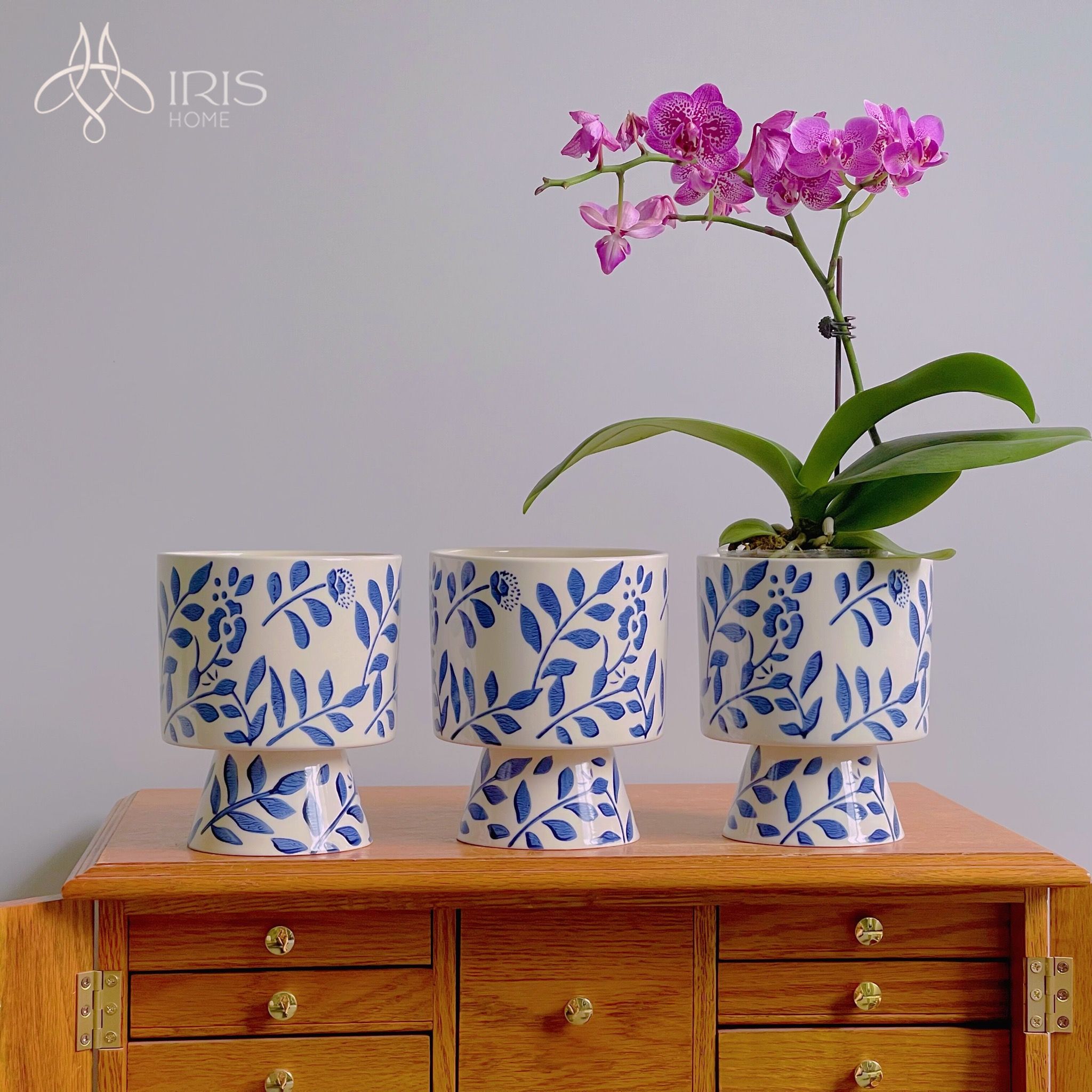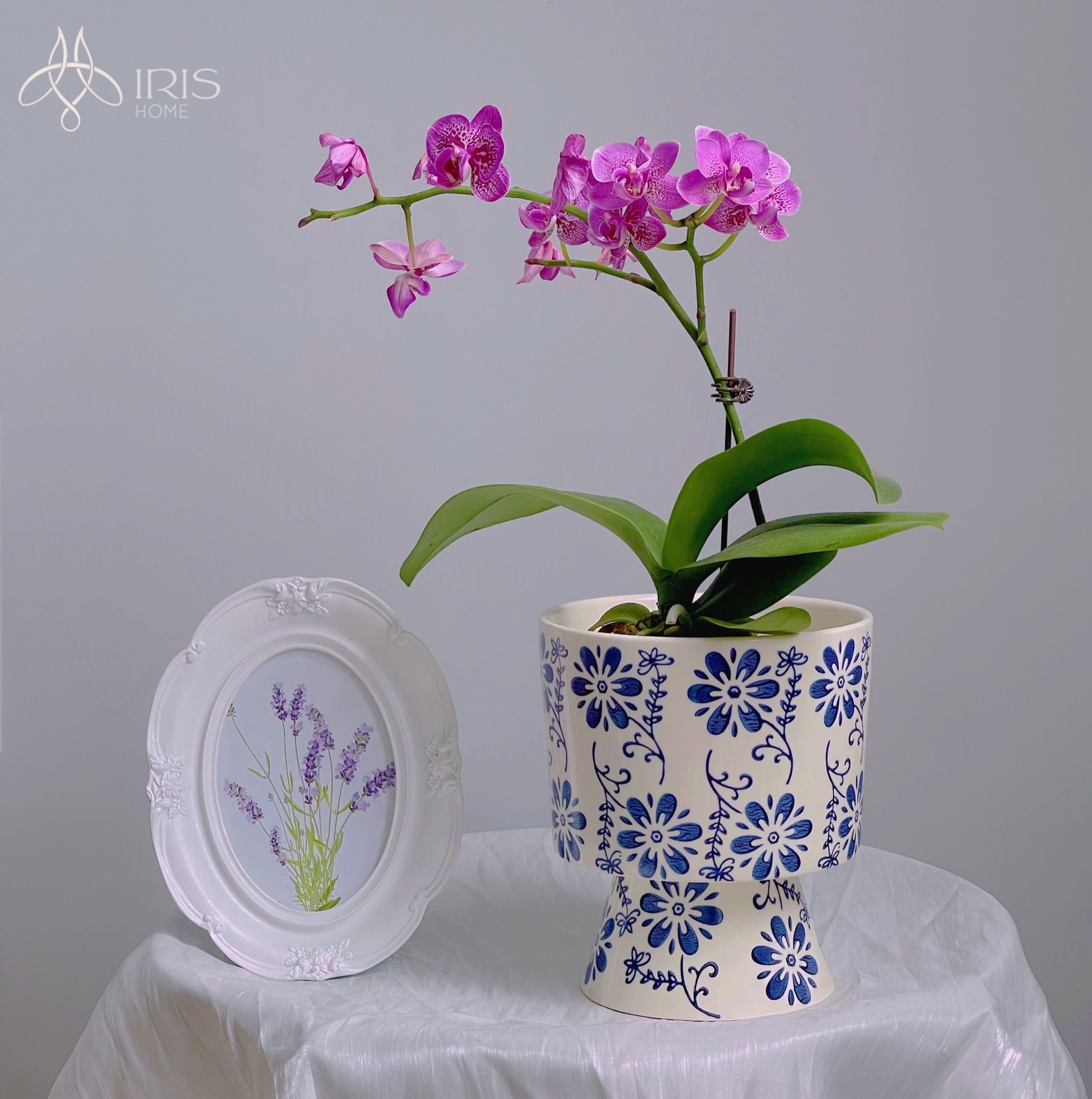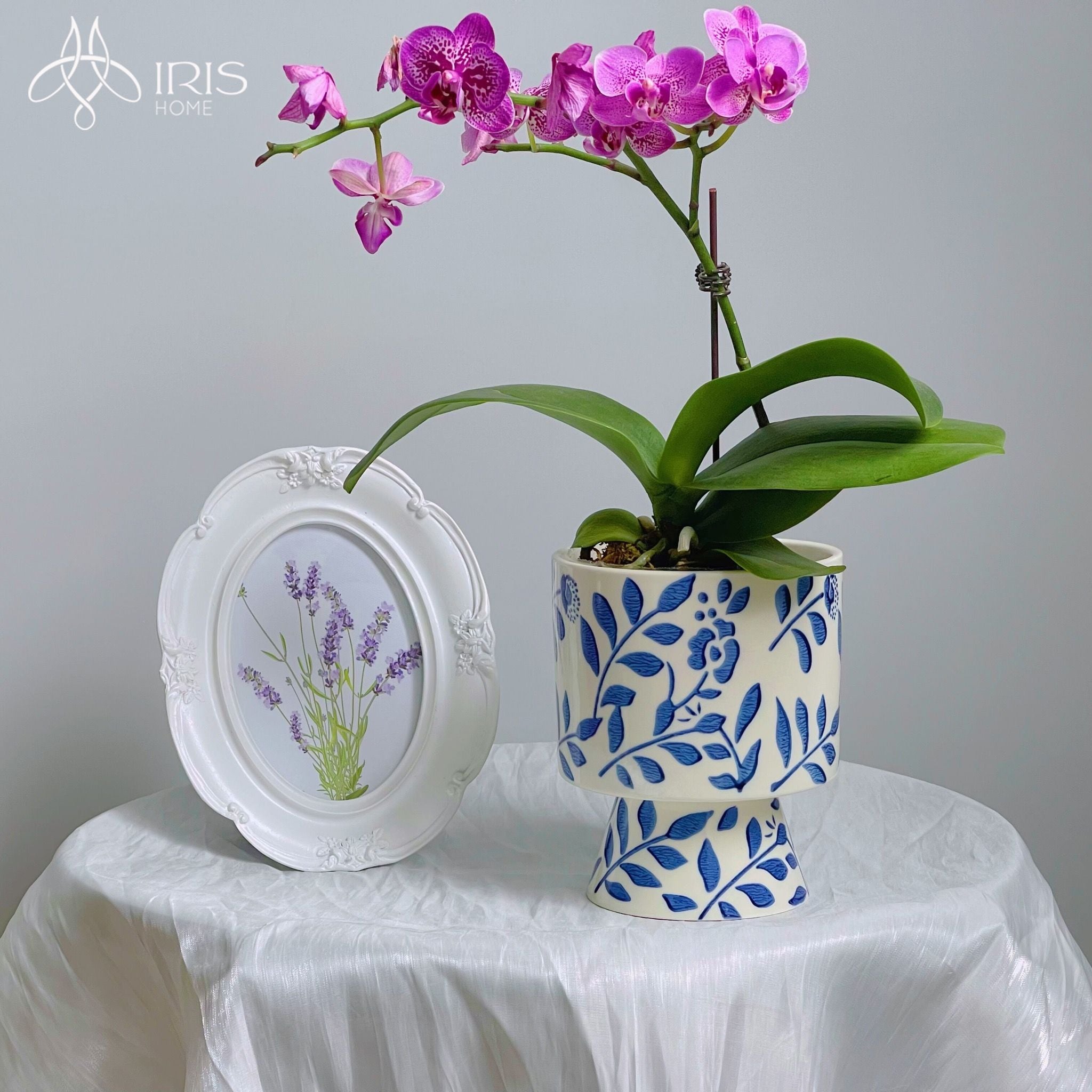 Tên: Chậu cây tròn đế chóp hoạ tiết hoa trắng xanh