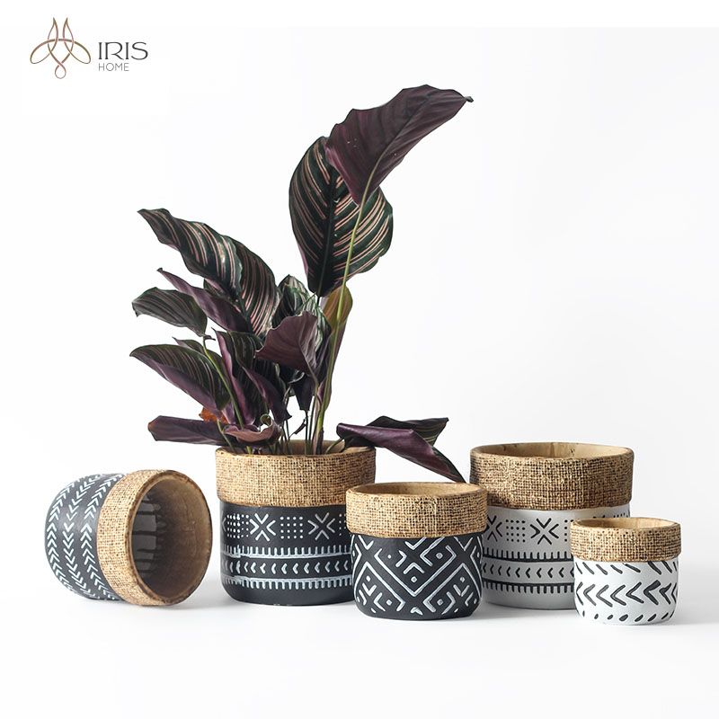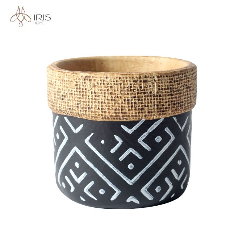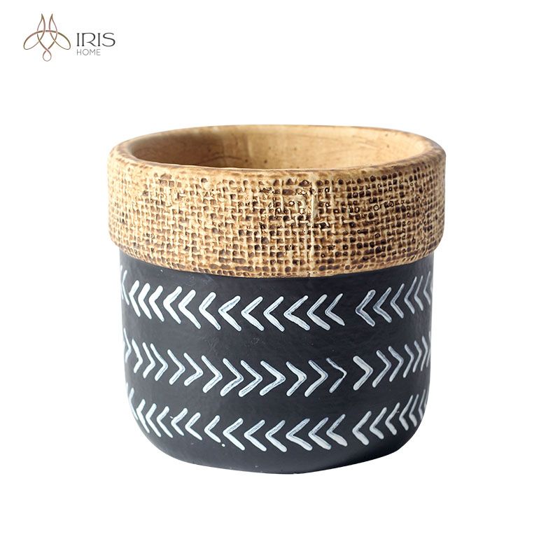 Tên: Chậu hoa cement đen viền giả đan, thân trang trí nét trắng
