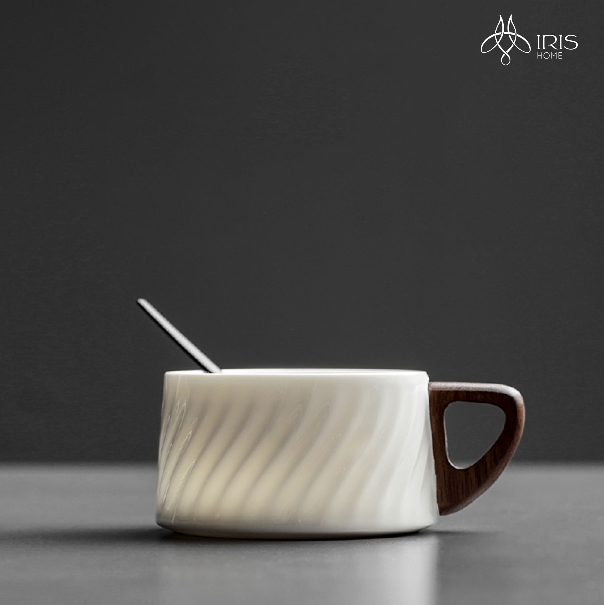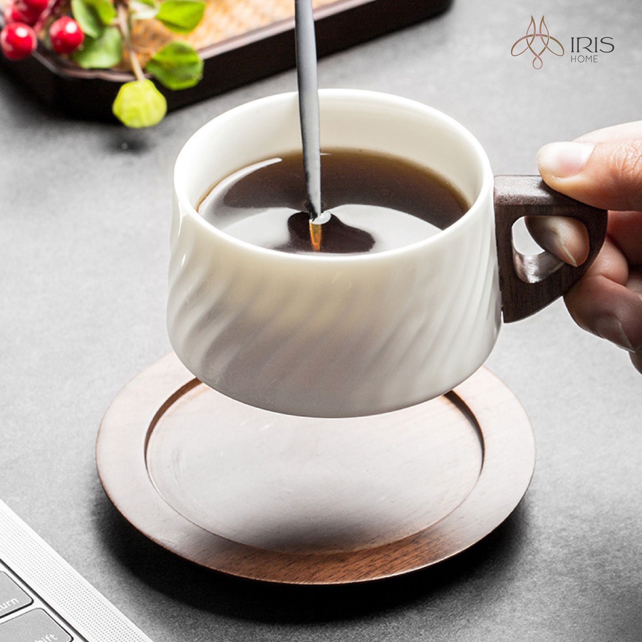 Cốc sứ hoạ tiết lượn sóng kèm đế lót gỗ