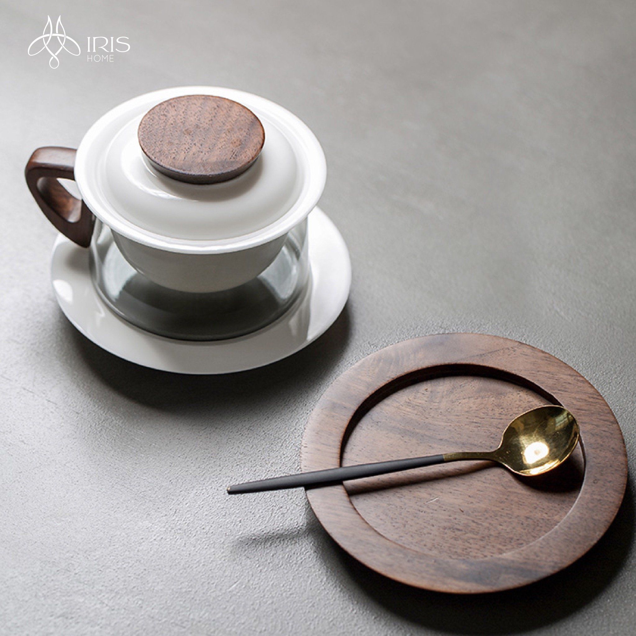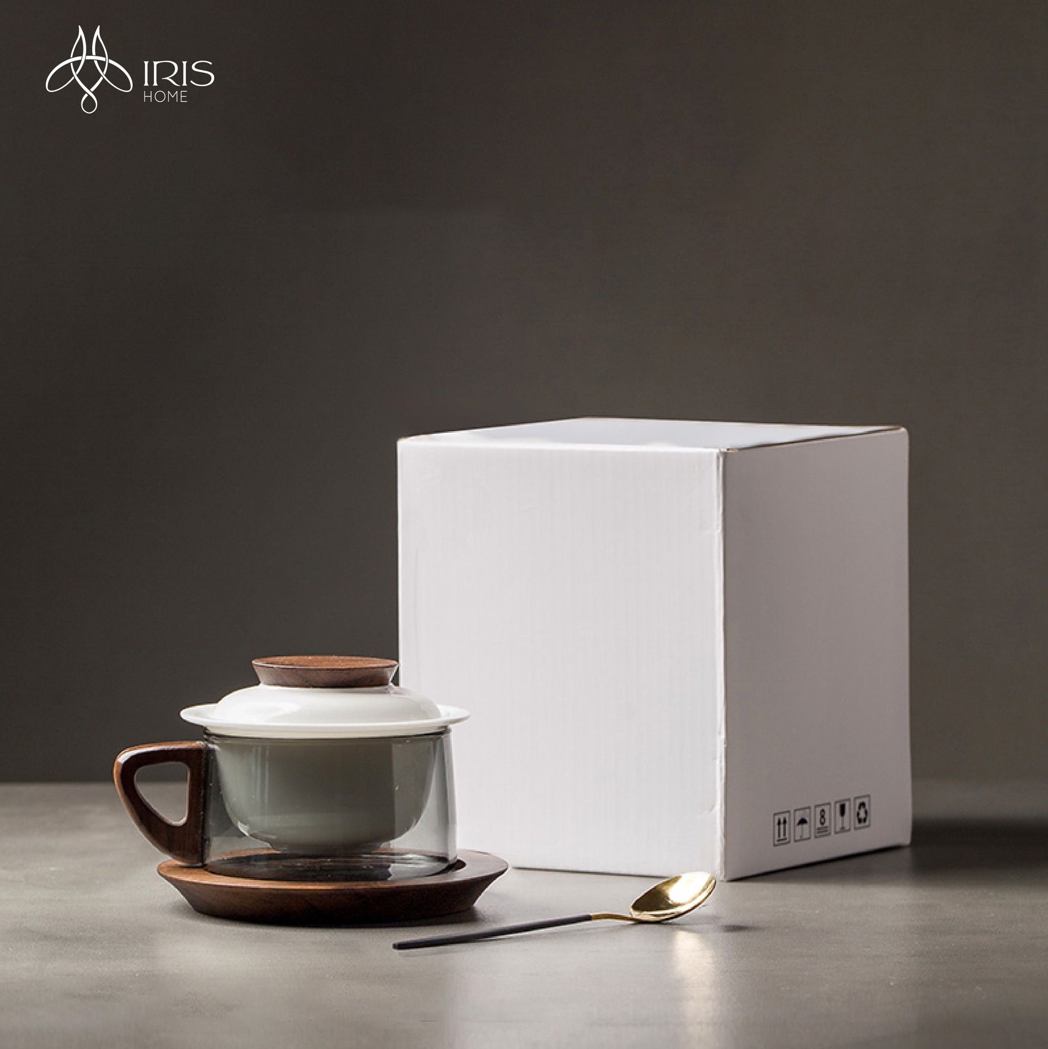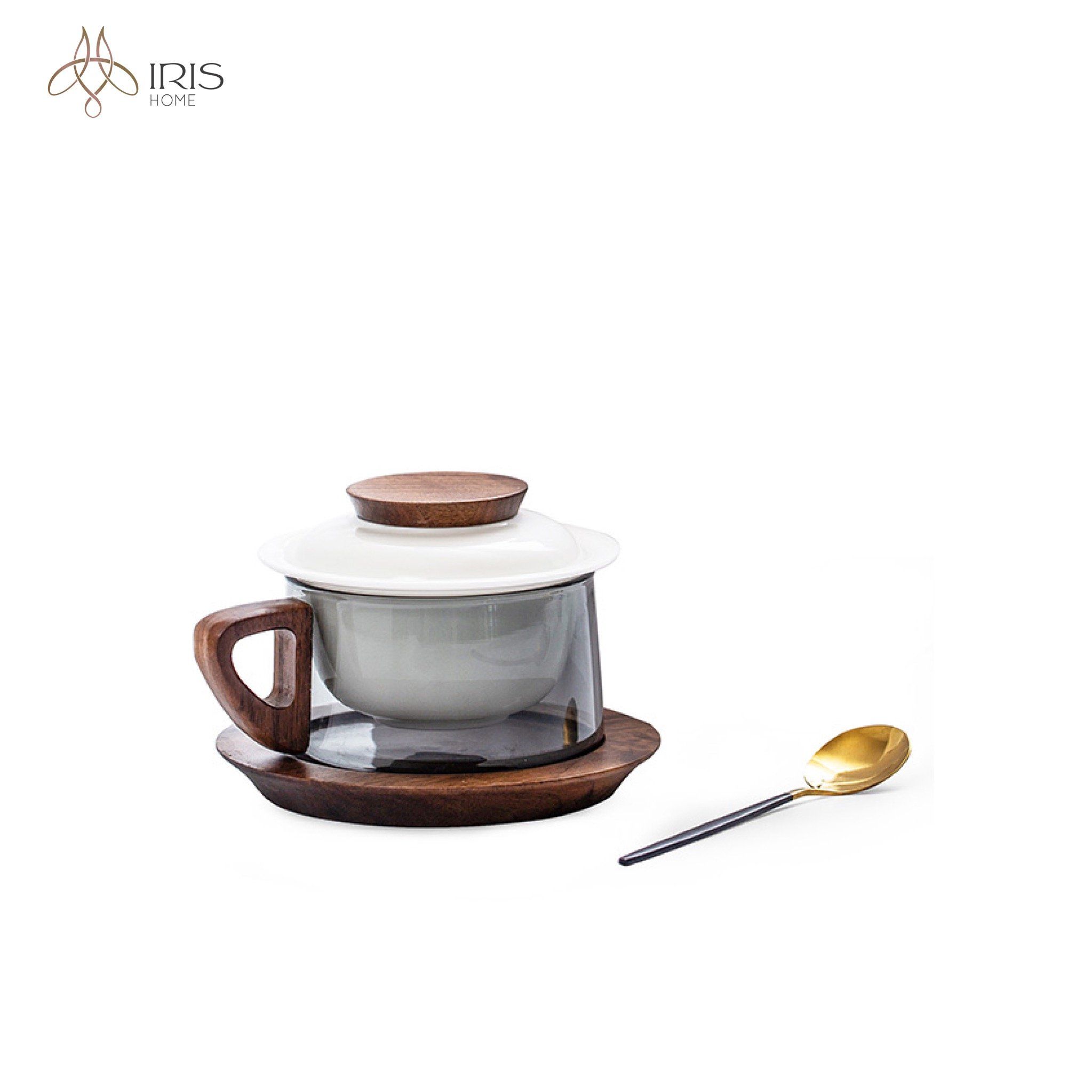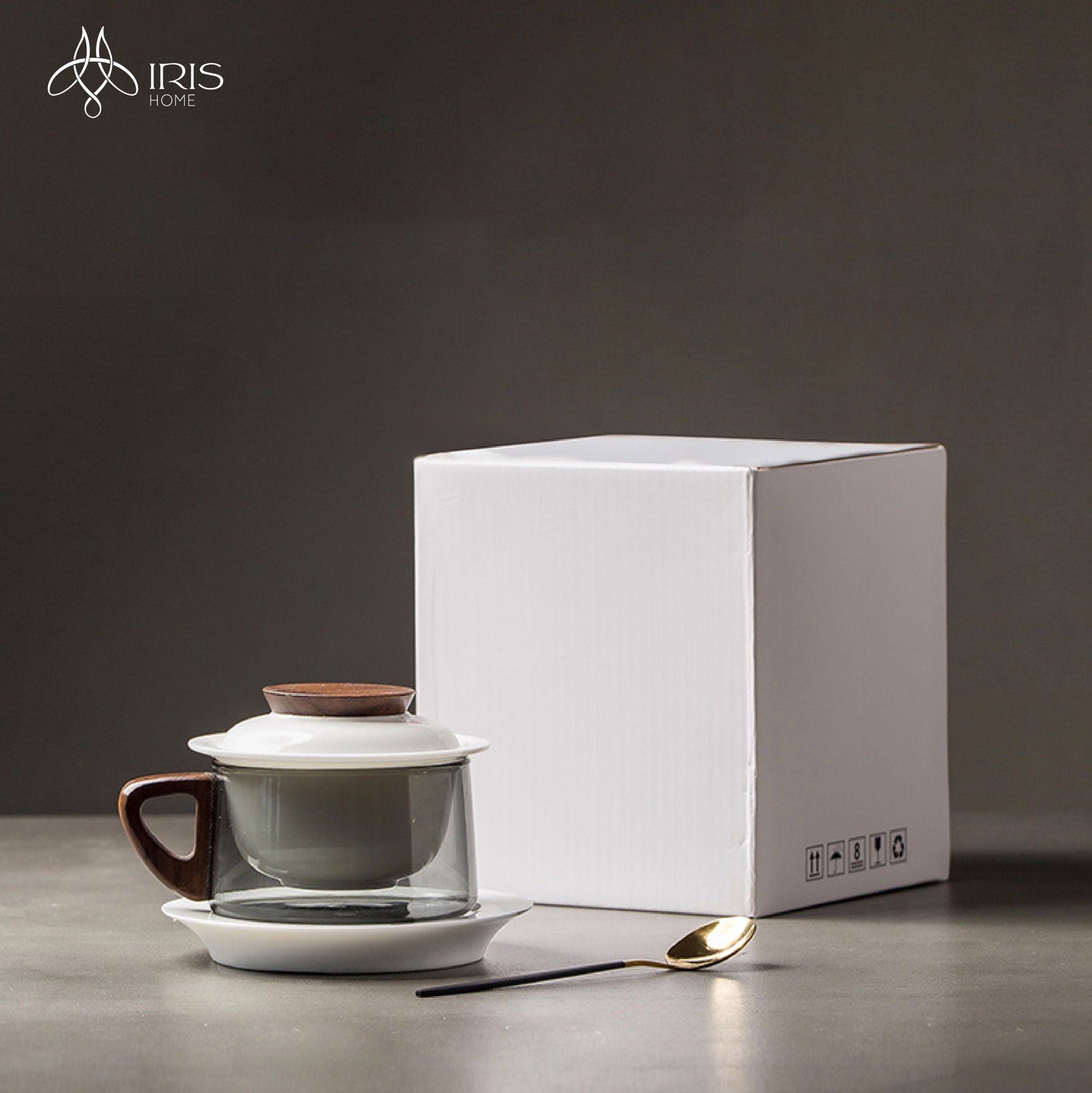 Chất liệu: Sứ trắng, thuỷ tinh xám, gỗ