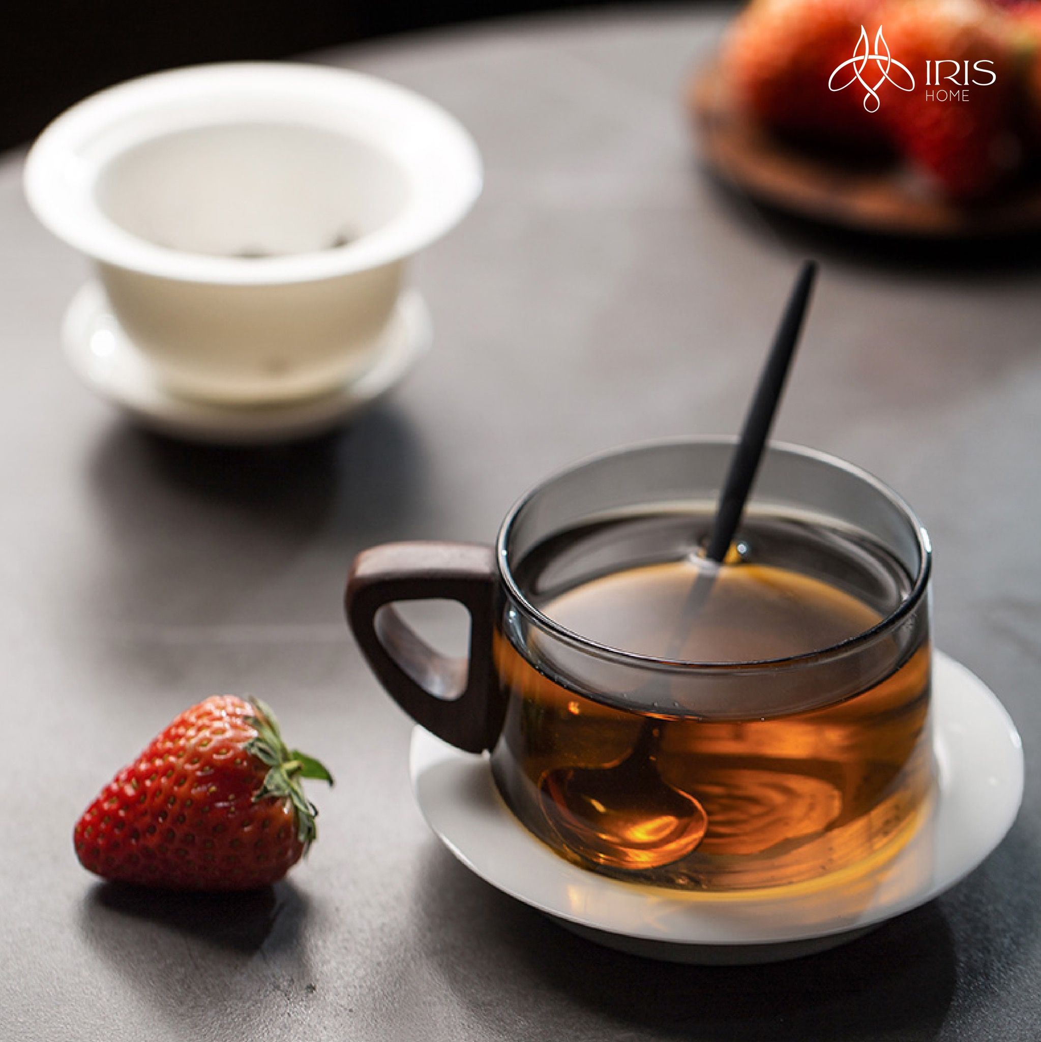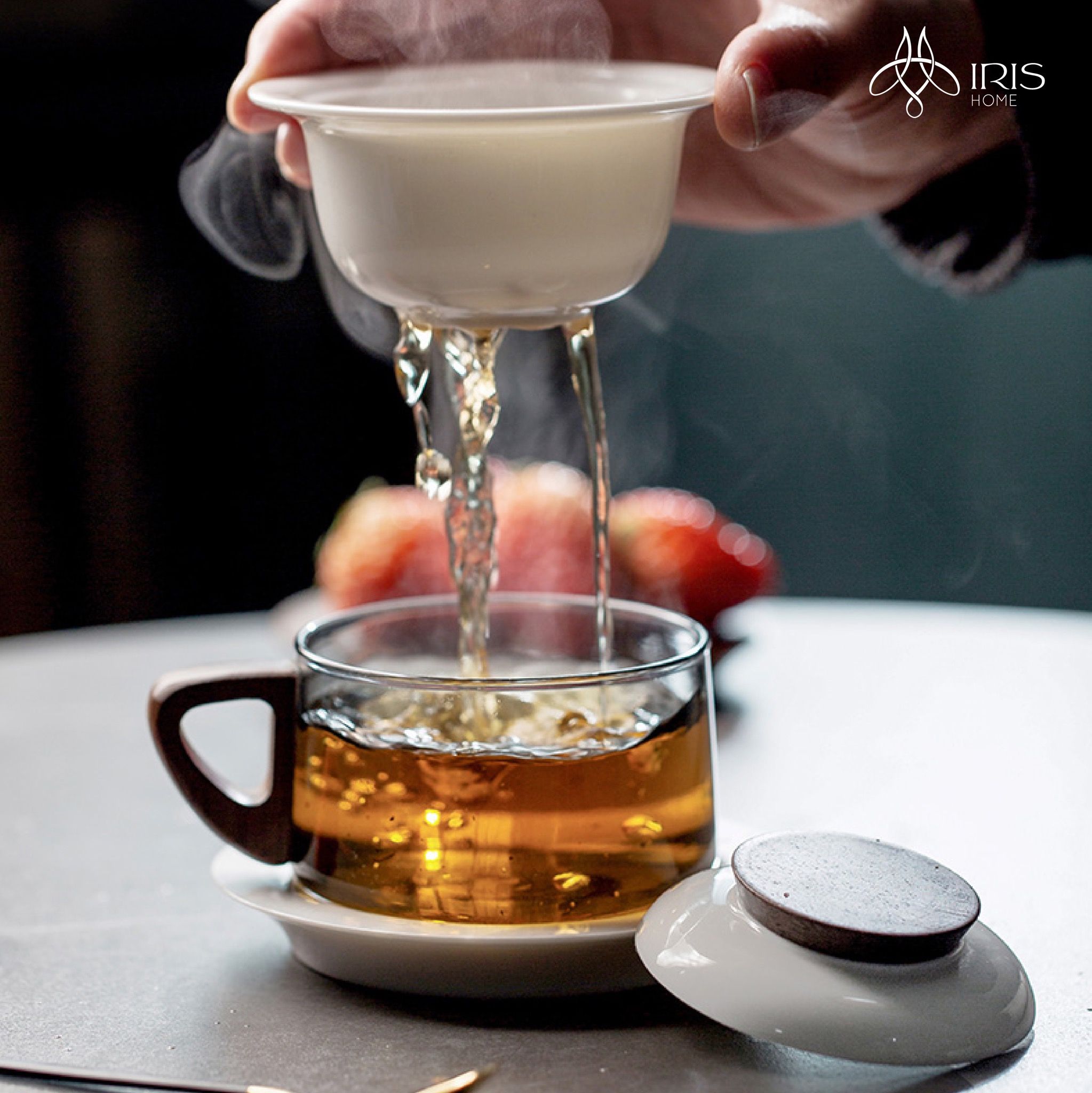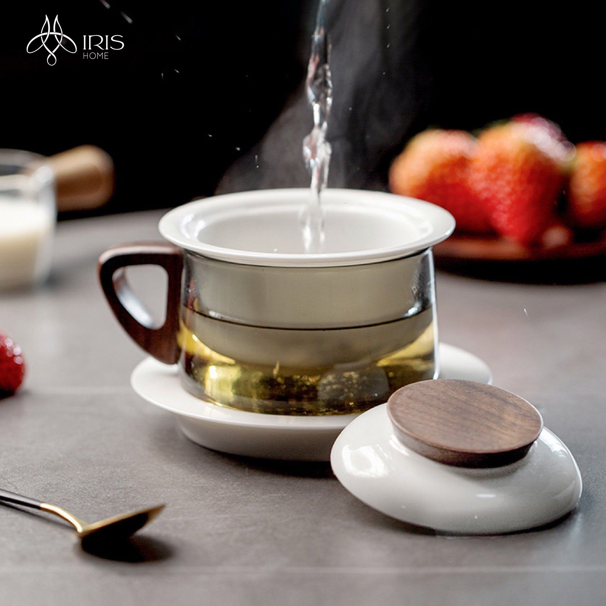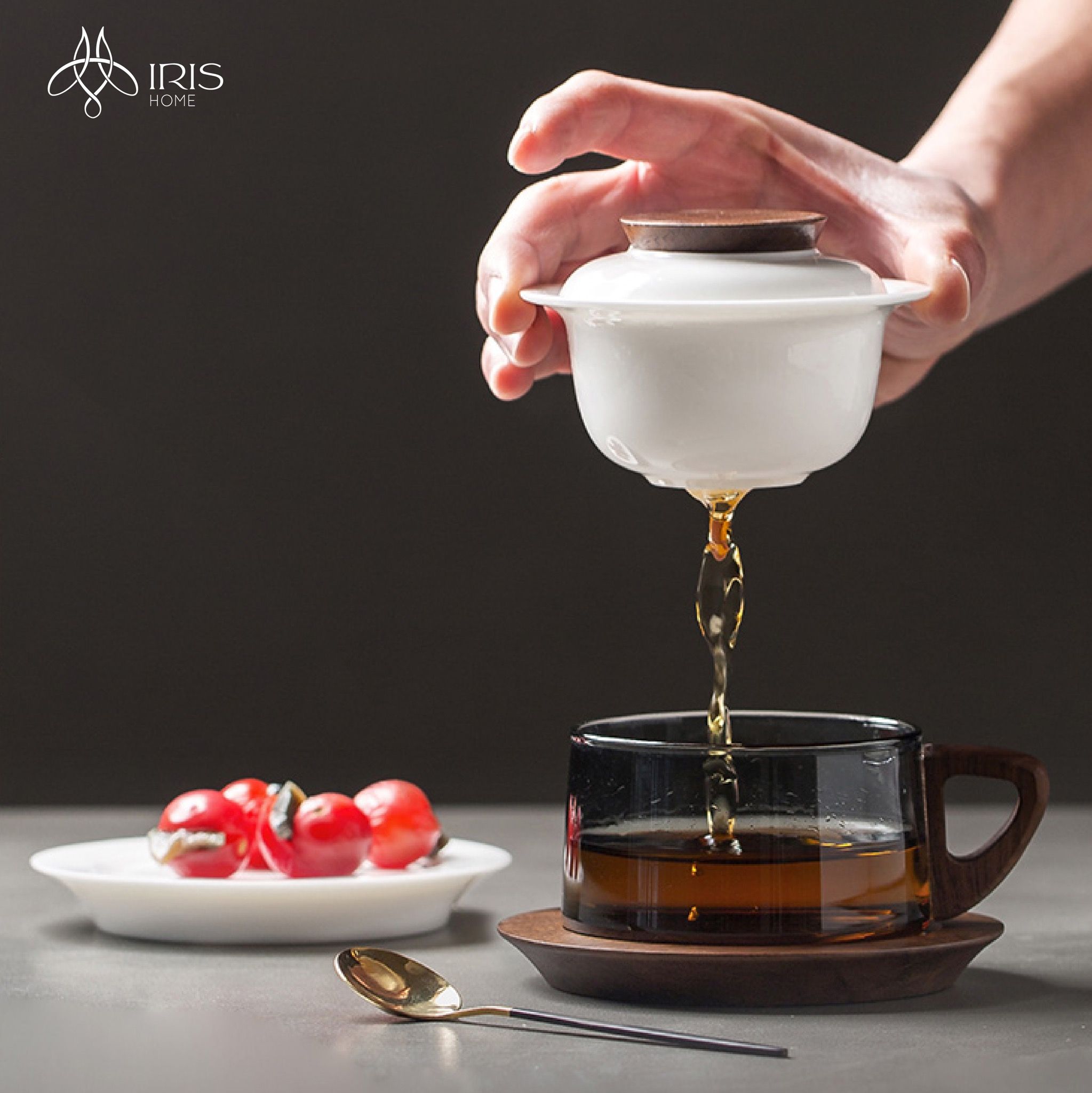 Chất liệu: Sứ trắng, thuỷ tinh xám, gỗ
