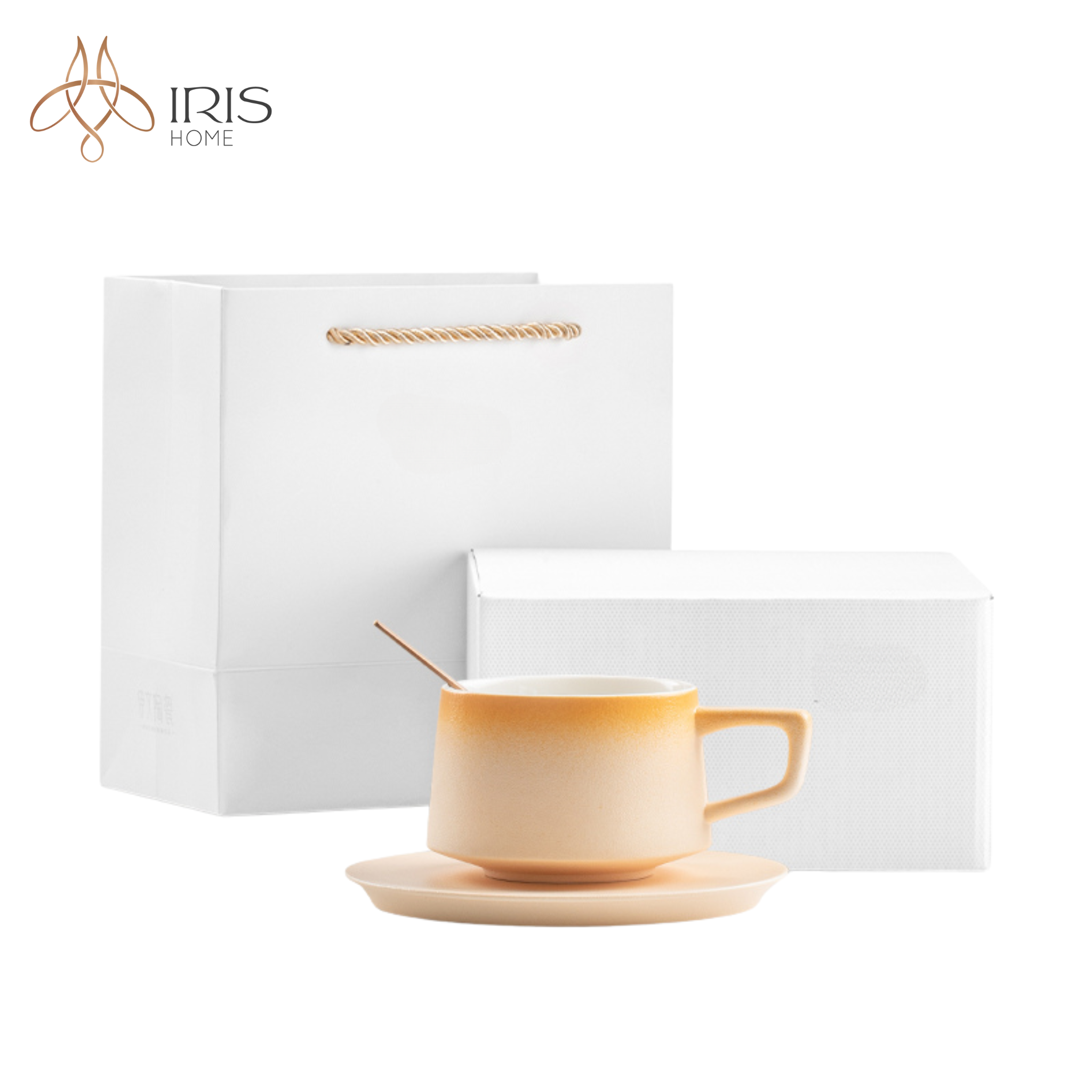 Tên: Cốc trà gốm sứ vân nhám gradient vàng mơ kèm đĩa và thìa