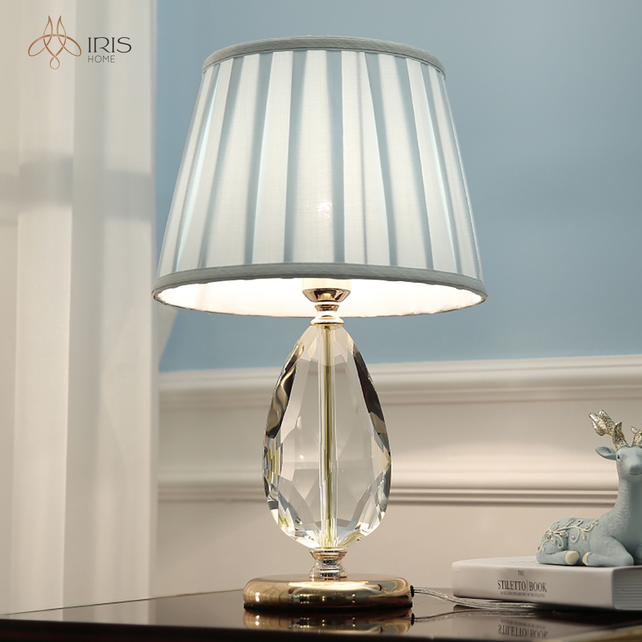 Chất liệu: Chụp vải diềm xanh, thân pha lê, đế tròn. Sử dụng công tắc tắt bật