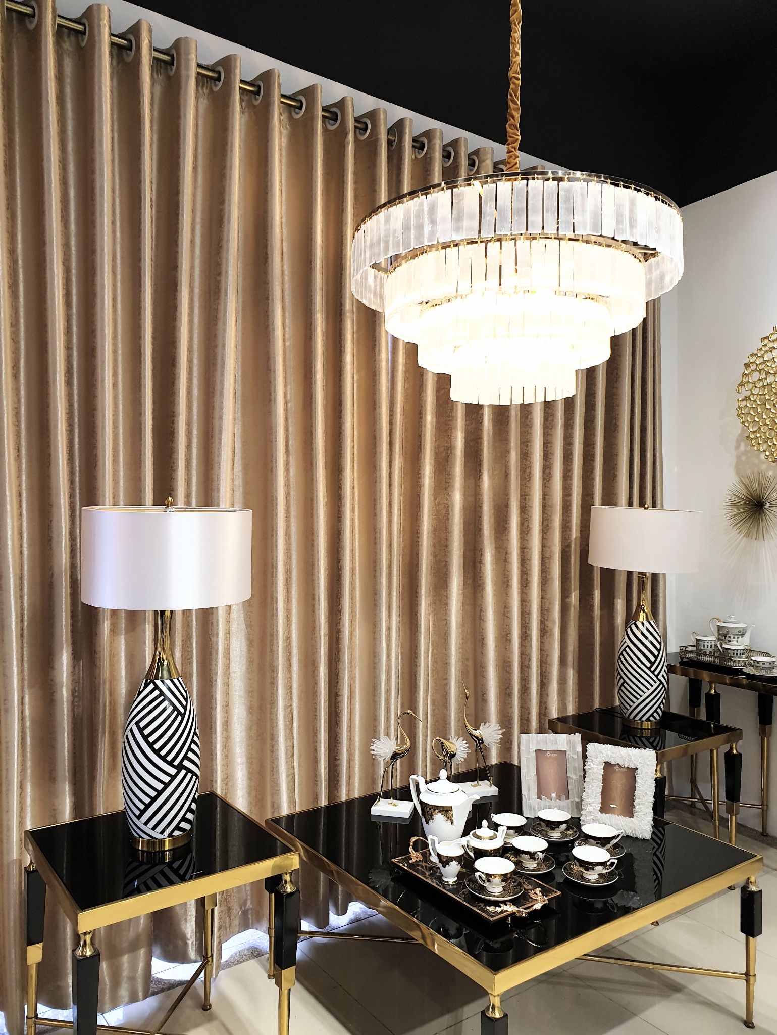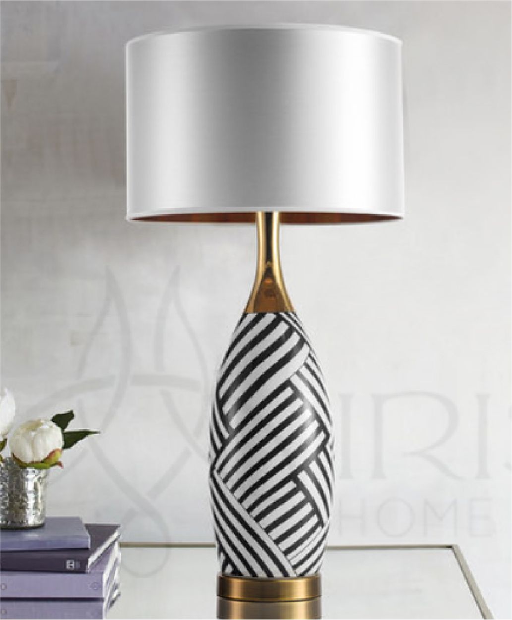 đèn bàn gốm họa tiết xọc kẻ đen trắng, cổ sơn vàng