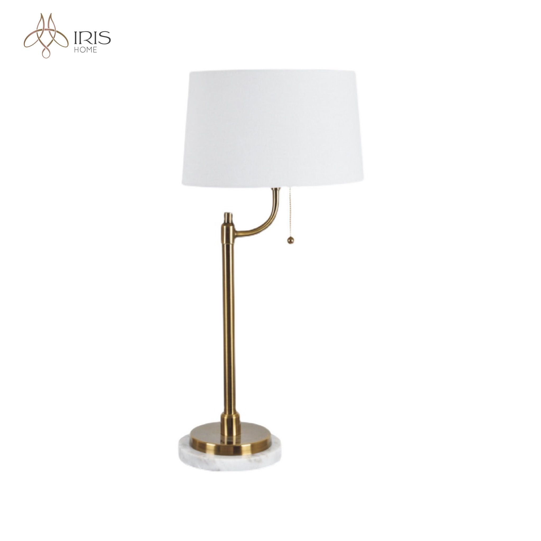 Tên: Đèn bàn chụp vải, thân kim loại mạ vàng kết hợp đế đá marble trắng. Sử dụng công tắc kéo thả