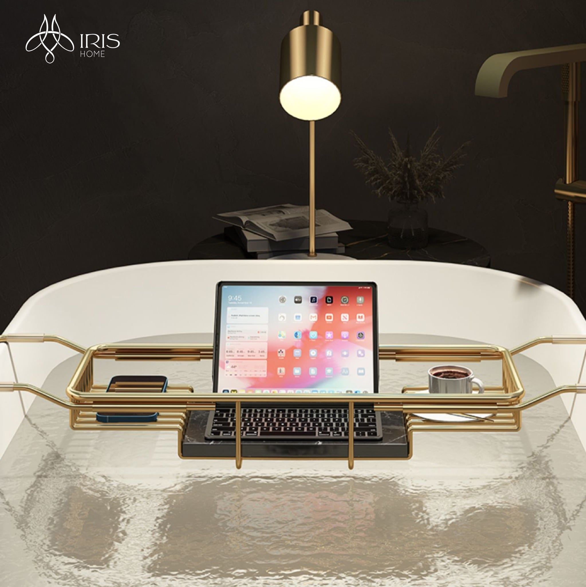 Tên: Giá đỡ bồn tắm thép không gỉ mạ PVD vàng, chi tiết đá marble đen. Có thể kéo dài