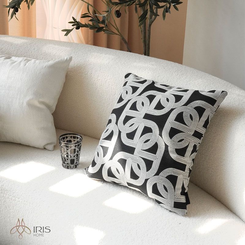 Gối vải vuông in hoạ tiết đường vòng trắng nền đen