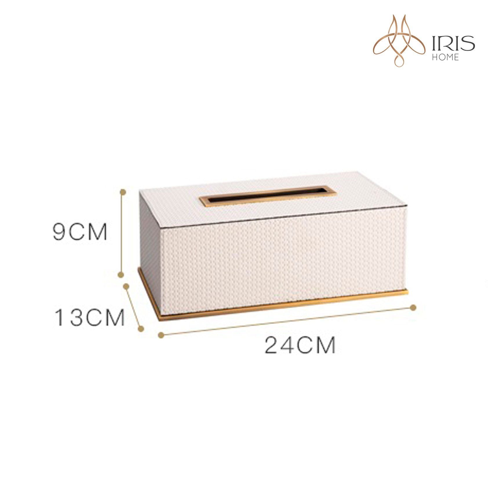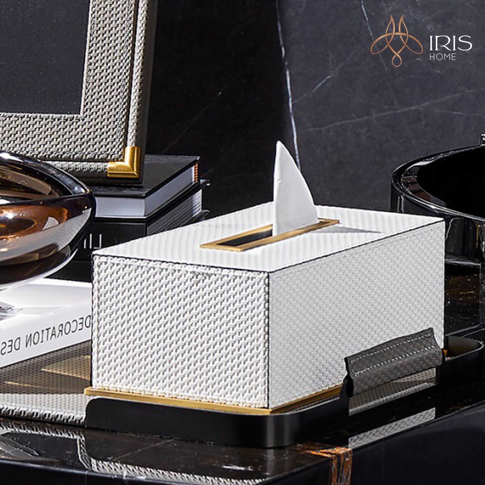 Hộp giấy ăn chữ nhật có hình dáng cơ bản,nhưng mang dáng vẻ sang trọng với chất liệu bọc davaf khung kim loại
