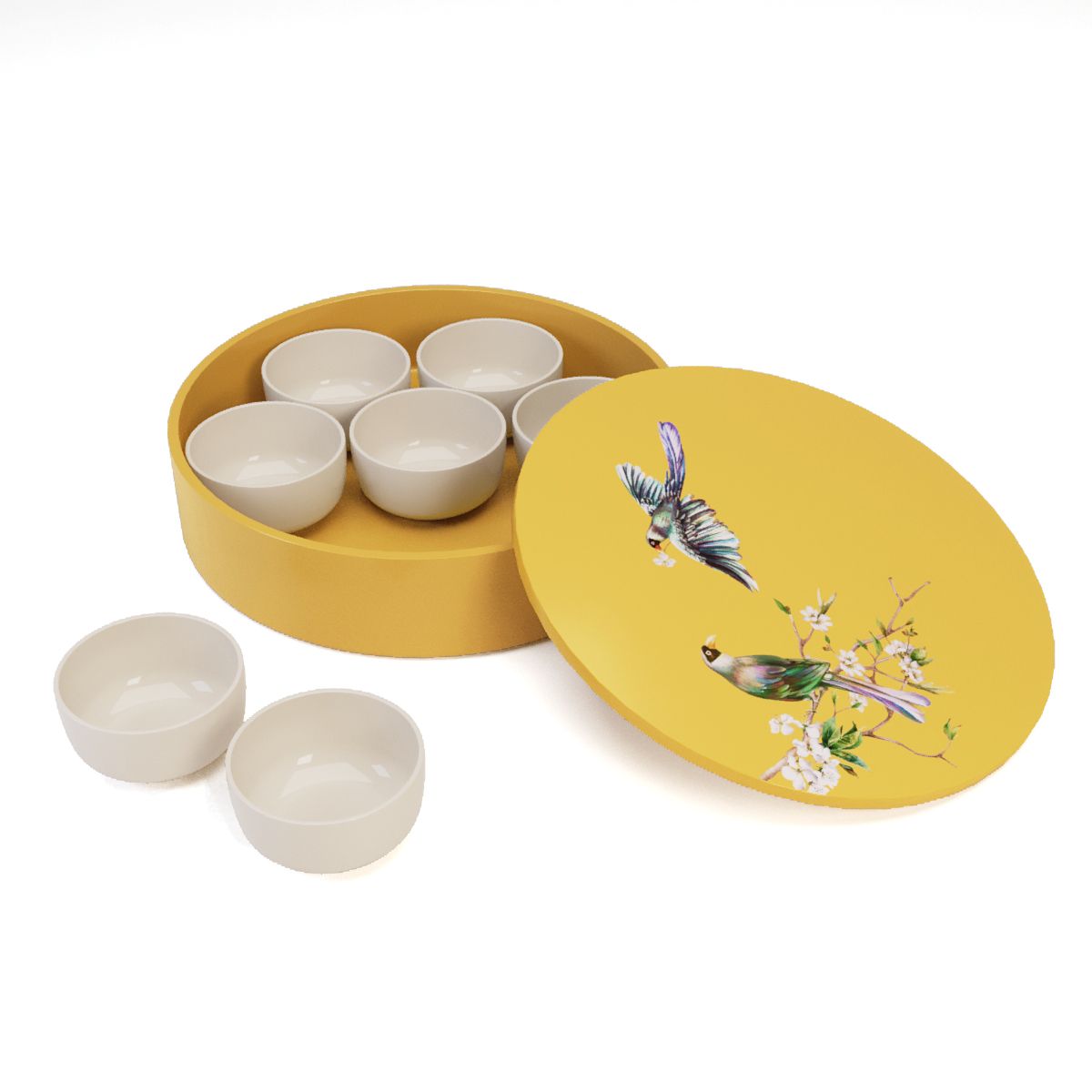 Sản phẩm bao gồm : Hộp đựng sơn mài và 07 chén sứ