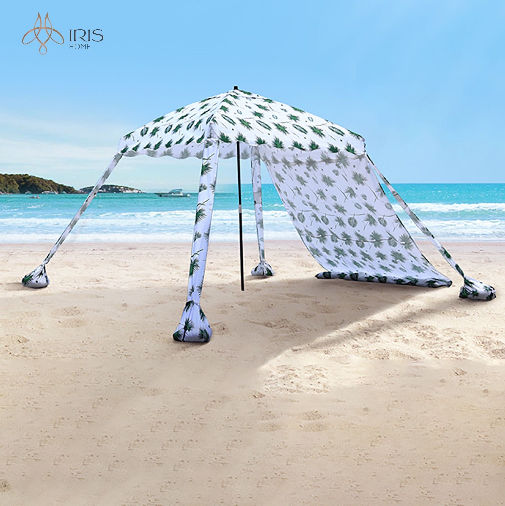 Tên: Lều che nắng dáng canopy. Cố định 4 đầu bằng túi cát. Vải chống tia UV