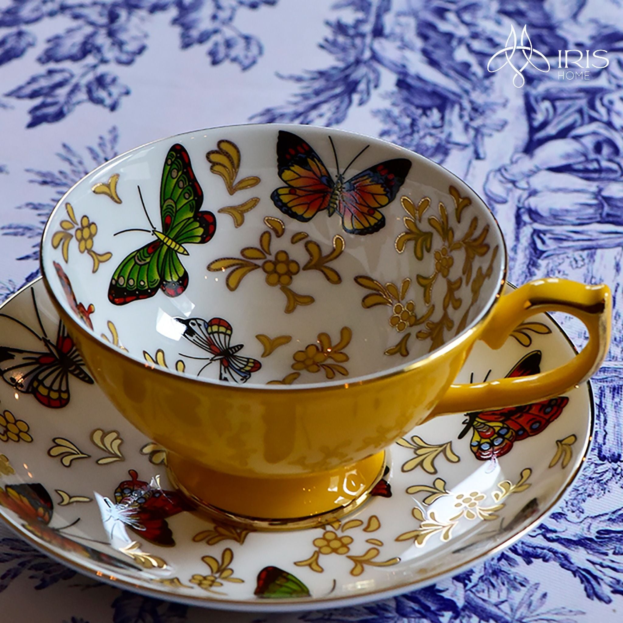 Chất liệu: Sứ xương, chi tiết vàng lỏng vẽ tay + in decal lụa hoạ tiết lòng tách