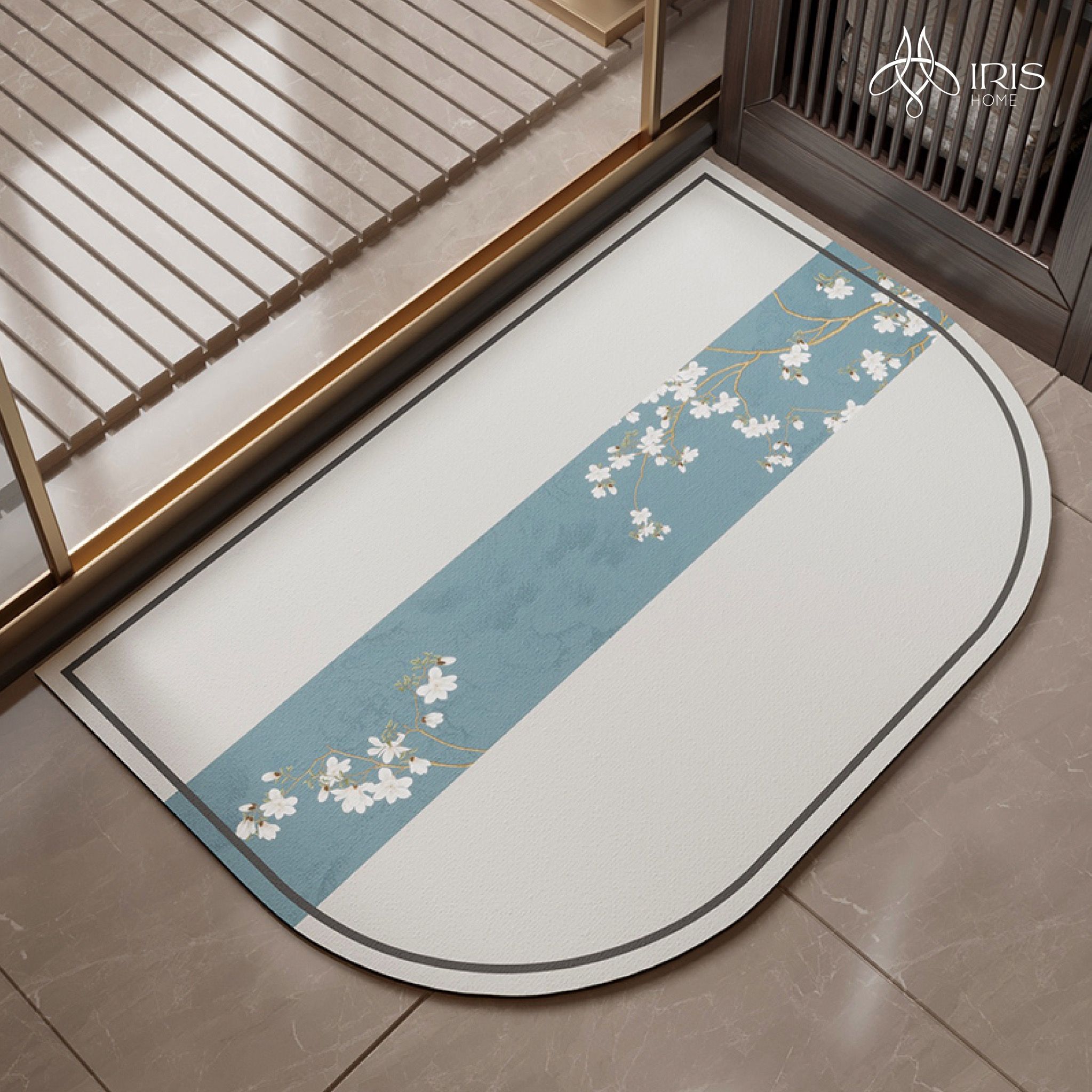 Thảm mềm chống trượt in hoạ tiết hoa trắng viền xanh