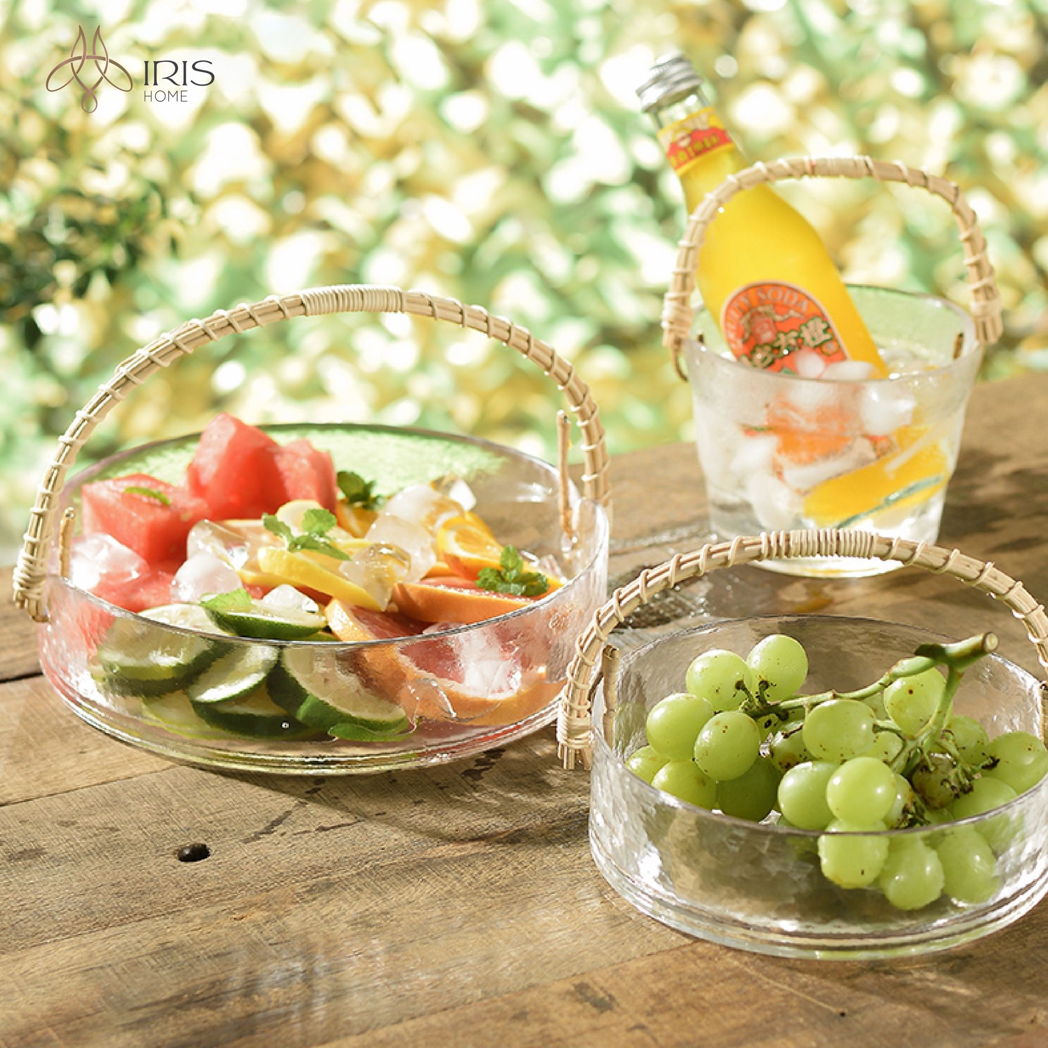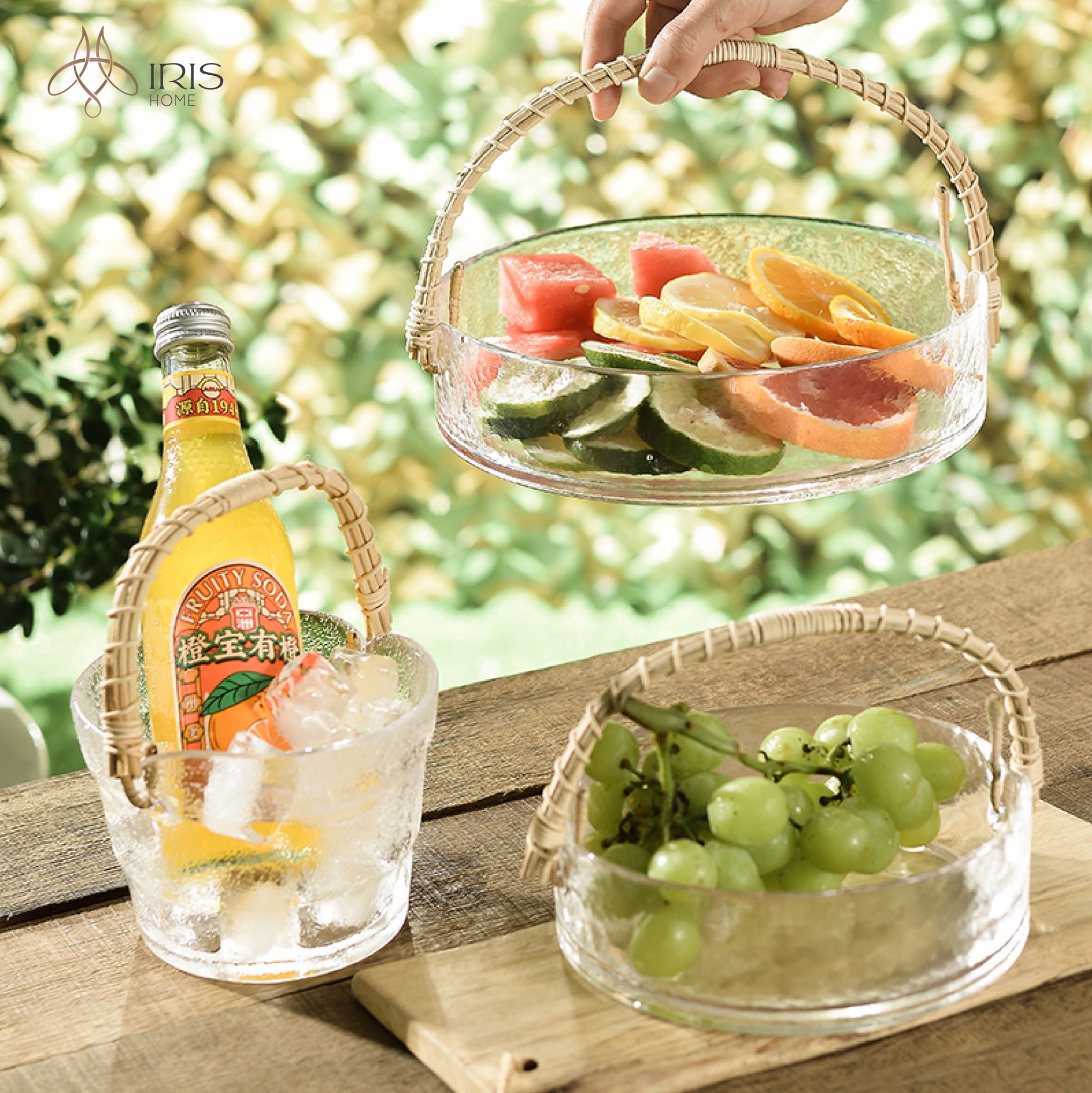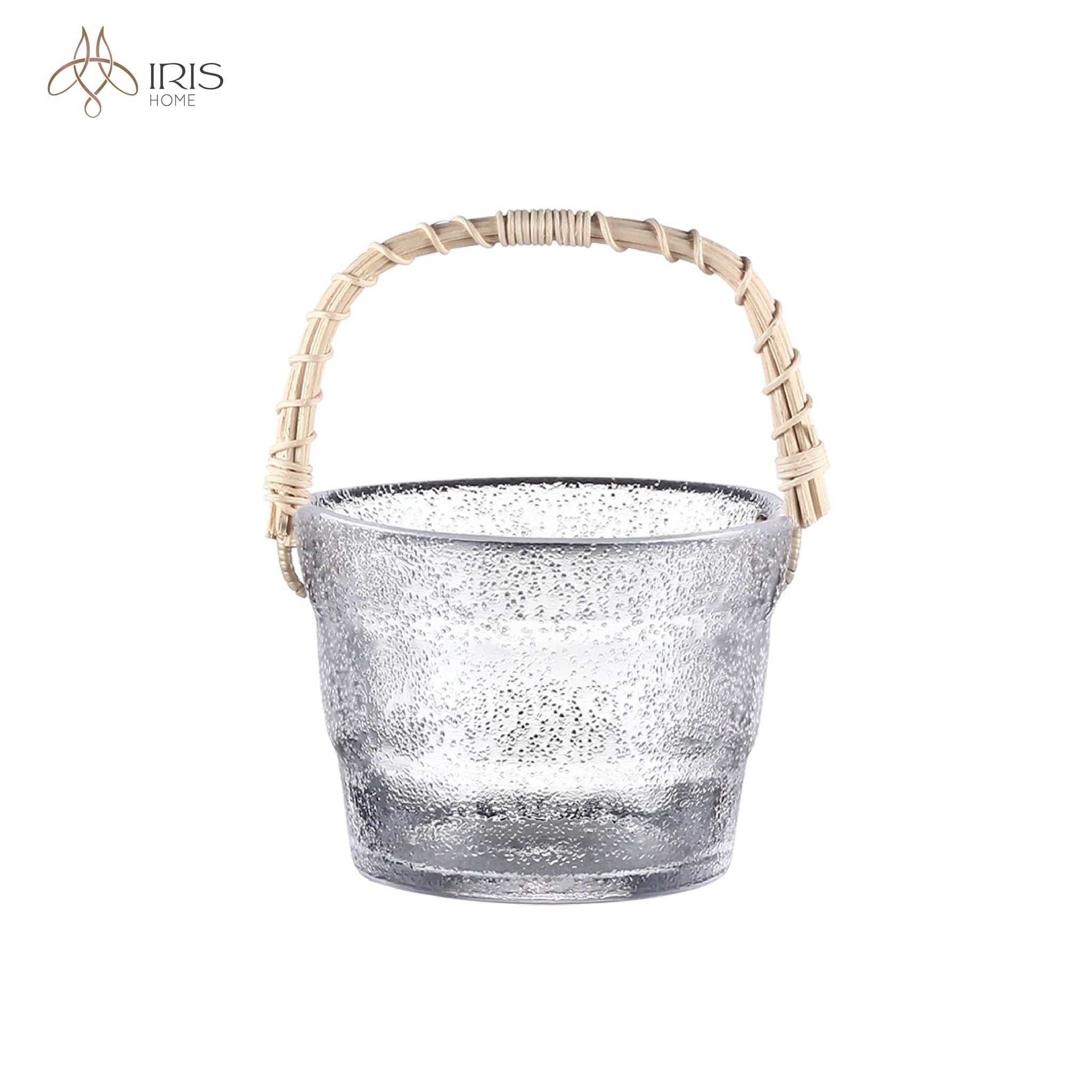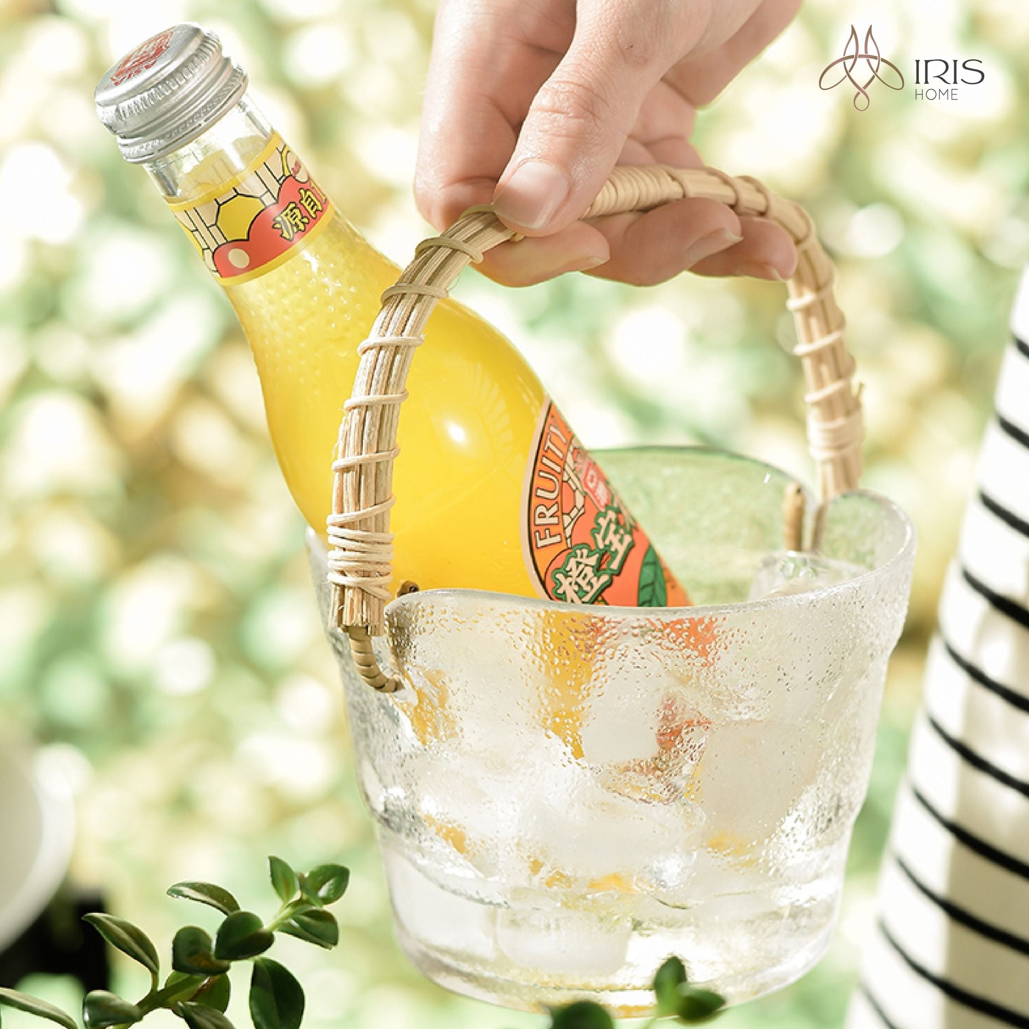 Xô đựng đá thuỷ tinh quai mây đan kèm kẹp gắp đá